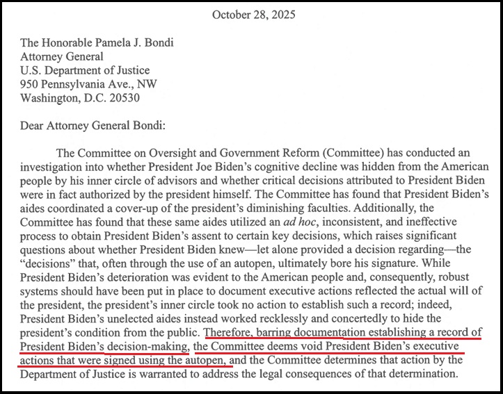 The House Oversight and Reform Committee has released a 100-page report [pdf HERE] highlighting how people around Joe Biden hid information about his cognitive incapacity and worked around the issue using his autopen signature to authorize presidential actions.