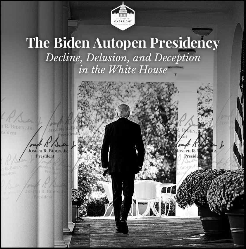 WASHINGTON—Today, the House Committee on Oversight and Government Reform released a staff report titled “The Biden Autopen Presidency: Decline, Delusion, and Deception in the White House.” The report exposes how President Joe Biden’s top advisors, political operatives, and personal physician concealed the President’s mental and physical decline from the American people. The findings reveal that as President Biden’s condition deteriorated, his aides exercised presidential authority and facilitated executive actions without his direct authorization, including misusing the autopen and failing to properly document decision-making processes.