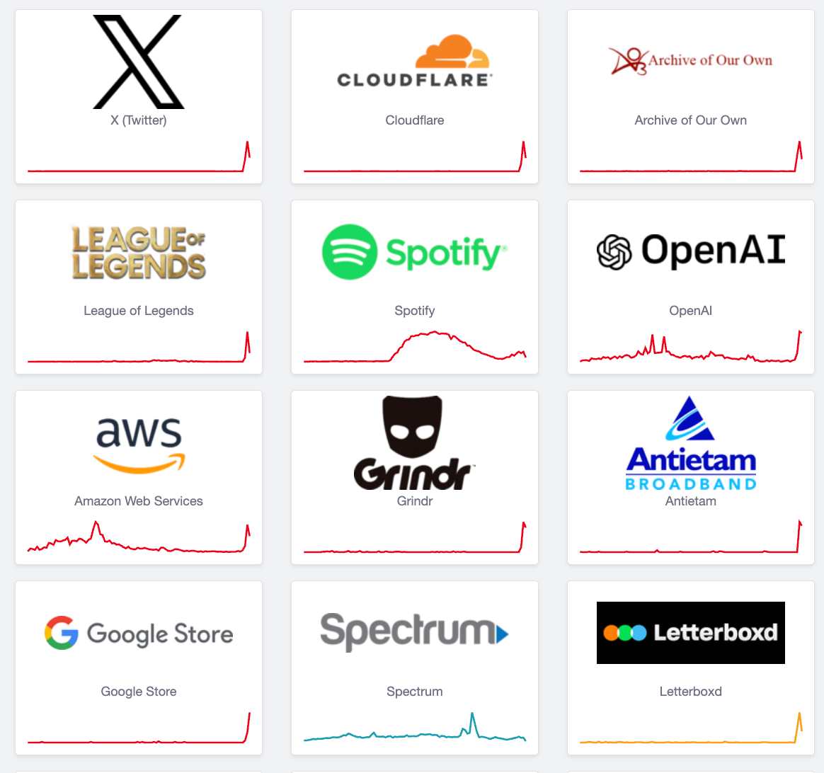 Besides X, impaced sites via Downdector data include: