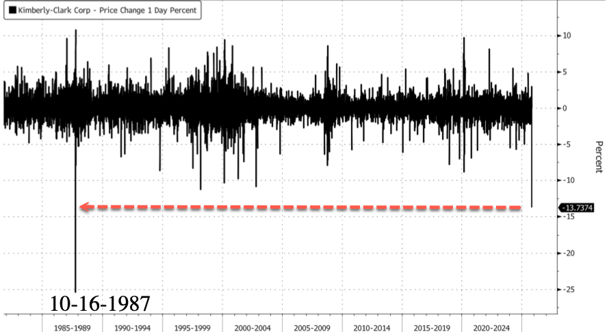 Kimberly-Clark shares remain down around 14.5% in late-afternoon trading. If the losses hold into the close, it would mark the company’s steepest one-day drop since October 16, 1987, or just days before the Black Monday crash on October 19, 1987. Earlier, the Kleenex maker unveiled plans to acquire Tylenol producer Kenvue in a $48.7 billion cash-and-stock deal. The announcement sent Kenvue soaring, up 20%.