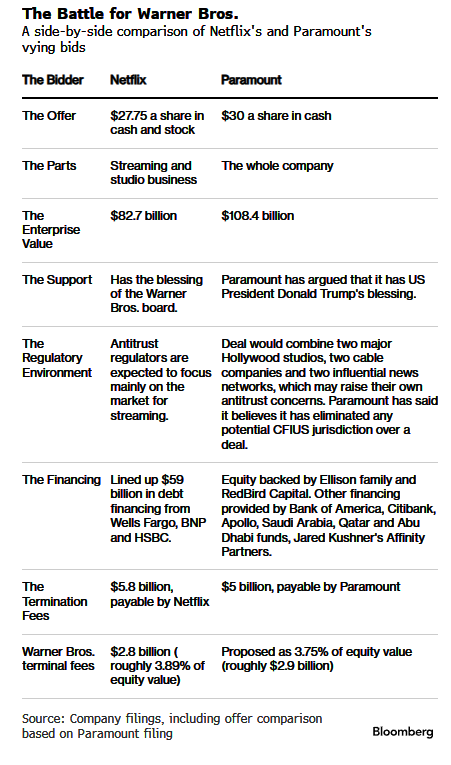 Here’s the side-by-side comparison of the Netflix versus Paramount-Skydance offers as the bidding war for Warner Bros.’ assets goes into overdrive.